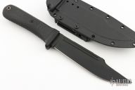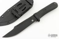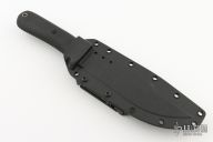 The Bastinelli Montana is a fixed blade knife that is perfect for outdoor utility and tactical tasks. The blade has a slight forward angle that aids in chopping power, and an abrupt clip point that aids in piercing power.  .205" Blade Stock.  1.475" Blade Depth. The handle is made of Kraton with a steel guard. The knife includes a kydex sheath. Excellent Condition.