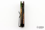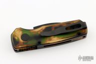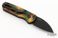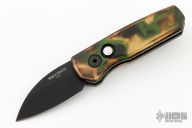 The Runt 5 by Pro-Tech Knives features a black sheepsfoot style blade. The handle features a smooth Woodland Camo aluminum handle with a black tip up stainless steel pocket clip. Black lip pearl push button. Comes with original box and papers. Excellent condition.