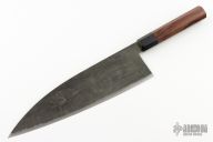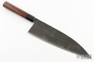 The Gyuto by Takeda is traditionally used for cutting a head of cabbage or slicing meat. The blade is stainless clad Aogami Super Steel (NAS) which is a high-carbon steel alloy with vanadium, .105" blade stock and 2.541" blade depth, hidden tang construction. As with all of Takeda's knives, it has a strong sharp edge. The octagon shaped wood handle is easy to hold. 242mm cutting edge. Comes with original box. New from maker!
