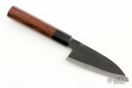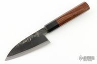 The Banno-KoDeba knife is traditionally used as a paring knife or all-purpose small kitchen knife. The blade is Stainless Clad Aogami Super Steel (NAS) which is a high-carbon steel alloy with vanadium. As with all of Takeda's knives, it has a strong sharp edge. The octagon shaped wood handle is easy to hold. 110mm cutting edge. Brand new from maker. Comes with original box.