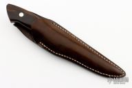 This sheath knife by Shosui Takeda features a Stainless Clad Aogami Super Steel (NAS) blade, .142" blade stock and .885" blade depth, hidden/mortise tang construction. The handle has nickel silver guard, ziricote grip with nickel silver pins. Comes with a brown leather sheath. Handle by Moriya. New from maker.