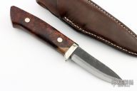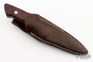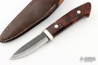 This sheath knife by Shosui Takeda features a Stainless Clad Aogami Super Steel (NAS) blade, .133" blade stock and .956" blade depth, hidden tang construction. The handle has nickel silver guard, box elder burl grip with nickel silver pins. Comes with a brown leather sheath. Handle by Moriya. New from maker.