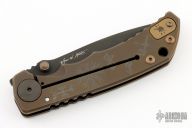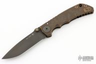 This Harsey framelock folder by Spartan Blades features a black drop point S45VN blade with dual thumbstuds and a notched thumbrest. The handle has an anodized titanium frame with a laser engraving.  Has nice detent, lockup, and blade seating. Comes with a padded zippered case.  Excellent Condition.