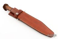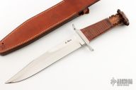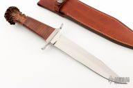 This Sub-hilt Fighter by David Sharp features a mirror polished blade with sharpened top edge, .272" blade stock, 1.383" blade depth, hidden tang. The handle has a satin finished stainless steel guard, stacked leather grip with a crown stag butt. Comes with a brown leather sheath. Excellent condition. One of a kind. Comes with a zippered case.