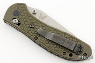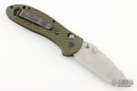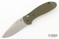 This Griptilian by Benchmade features a stonewash finished blade with notched thumbrest and dual thumbstuds. The handle has green G10 scales, black stainless steel clip, stainless steel liners. Has some light scuffs and scratches otherwise, excellent condition.