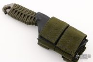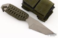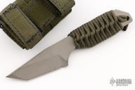 This knife by Strider Knives features a bead blasted tanto blade with notched thumbrest, .247" blade stock and 1.308" blade depth, full tang construction. The handle has a paracord wrap. Lanyard hole in pommel. Includes kydex sheath. Has some scuffs otherwise excellent condition.