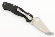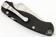 This Paramilitary 2 Linerlock Folder from Spyderco has a satin finished clip point blade with thumb hole and notched thumb rest. Handle is black G10 with stainless steel liners and stainless steel 4-way reversible clip. Excellent condition.