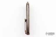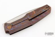 This FIF20 framelock Front Flipper by Philippe Jourget features a hand rub satin finished blade with a fileworked thumbrest. The handle has a full MokuTi frame with a matching backspacer and tip up pocket clip.  Includes a COA and a padded zippered case. Dated 07/2018.  Excellent Condition.
