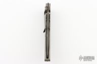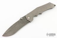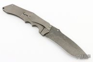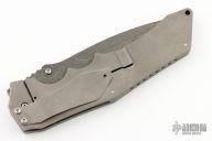This Super Villain by by Jim Burke is 1 of 2 made. It has a dark stonewashed blade with a notched thumbrest and a thumbstud, .176" blade stock and 1.850" blade depth. The handle has a stonewashed titanium frame with matching tip up clip and backspacer. Has nice detent, lockup and blade seating. Comes with a zippered case. Excellent condition.