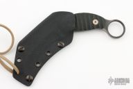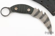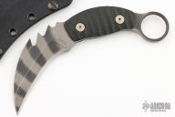 This MSC PS Karambit by Mick Strider features a tiger striped blade with sharpened top edge, .155" blade stock and 1.471" blade depth, full tang construction. The handle has sculpted black G-10 scales, ring at the butt. Comes with kydex sheath. Has sheathing marks otherwise the knife is in good condition.