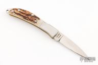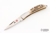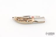 The diminutive Osprey™ an Al Mar Classic since 1979, offers timeless design and peerless craftsmanship usually found only on the finest custom hand made knives; all in the smallest, highest quality, front lock made today. The Osprey™ features stainless steel bolsters, Stag scales, brass liners and a stainless steel spring. Includes a brown leather sheath and the original box. Excellent Condition.