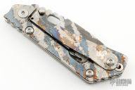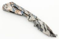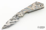 This PT by Mick Strider features a digicam blade with notched thumbrest and thumbhole. The handle has a digicam titanium frame with matching tip up clip. Excellent condition.