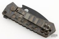 This Warthog framelock flipper by Crusader Forge features a KG 2418 Ti coated blade with a thumbhole and flipper. The handle has a flamed or "Phantom" finished titanium frame and matching titanium clip positioned for tip up carry. Nice detent, lockup and blade seating. Has a few light scuffs, otherwise excellent condition.