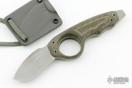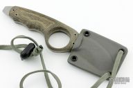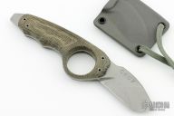 This neck knife by Crux (please let us know if you know who this maker is) features a chisel ground bead blasted blade with .136" blade stock and .952" blade depth, full tang construction with green canvas micarta scales. Comes with a kydex neck sheath. Has some light scratches, otherwise excellent condition.