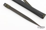 In 1988, he began making specialized knives for use by the military. This turned out to be fortunate turn of events, both for Mick and for the knife using world at large. Mick’s approach was to not get burdened by the weight of past designs. He started with a tabula rasa, a clean slate, informed only by his own experiences and knowledge of what a soldier needed in a knife. The knives he made didn’t look like the hunter-inspired knives seen in most PXs; instead they were almost brutish in their functionality: beefy, solid, and with unbreakable ¼” stock full tangs. These knives were the first indication of his innovative approach: in addition to their utilitarian design, the knives carried a subdued finish and subdued sheaths. No one carrying a Strider knife was going to be spotted because of sunlight glinting off of polished steel or a glossy leather sheath. Soldiers, policemen, and other men going into harm’s way couldn’t buy them fast enough. Mick sampled some good ideas, but made them great. For instance, he was not the first to wrap a knife handle with paracord, but he was the first to do it in a way that was tough enough for sustained infantry use. His knife line grew over the following years to include different varieties of fixed blades, all distinctive and many with specialized uses. But constant in all of them was a disregard for convention, and a desire to try new ideas. An example of this was the Ajax – it featured a very wide blade surface clearly designed to inflict damage. It drew on the weapons carried by Roman legionnaires, yet was modern and usable in the 21stCentury battlefield. Mick also worked on his technical skills, always striving to become better at the physical craft. At the 2002 Blade Show, a group of the best tactical knifemakers in the country decided to compete with each other to produce the most innovative and interesting fixed “battle blade” at the show. Mick’s entry, an incredible integral knife made out of ½” titanium stock with a zippered composite blade, gorgeous handles, and integral guard was the unanimous winner, and effectively retired the competition.