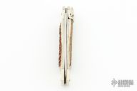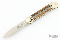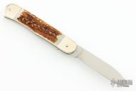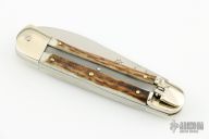 This Lever Lock Automatic by Hubertus Knives features a polished drop point blade. The handle is comprised of nickel silver double bolster and lever with stag scales over brass liners and steel backspacer. Includes the original box.  Excellent Condition.
