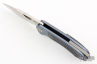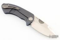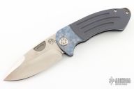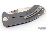 Theseus was an ancient Greek hero that killed the Minotaur in ancient Greek mythology. The blade is a classic drop-point style that is light, with its false edge, yet would leave a vicious wound channel. This knife really is the result of my evolving philosophy about blade and handle thicknesses and materials. This one has a tumbled D2 blade with notched flipper. The handle has a titanium frame with a D2 backspacer with lanyard hole and a tip up titanium clip. Excellent condition.