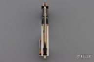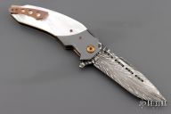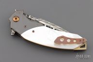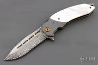 This linerlock flipper by Patrick Famin features Damascus blade with flipper. The handle has zirconium bolsters, mother of pearl scales, anodized titanium liners with jeweled interiors, anodized titanium backspacer, tip up titanium clip.  Nice detent, lockup, action and blade seating. Excellent Condition.