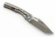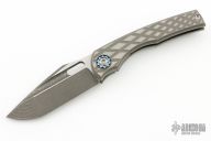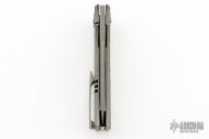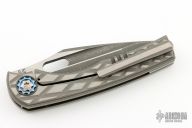 This BBM V2 by Nick Chuprin and Robert Carter features a two-tone acid wash finish blade with satin flats, fullers, thumbhole and milled bevels. The handle has a two tone factle milled titanium frame, Titanium hardware, and two tone anodized titanium backspacer. Two piece zirconium/titanium pivot and tip up clip with hidden screws. Rides on Skiff Made bearings, nice detent, lockup and blade seating. Comes with a zippered case and COA. Excellent condition.