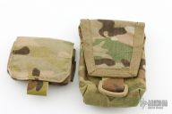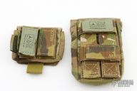 These vintage pouches by TAD Gear. The larger pouch is approximately 4.5"x4". Has an interior pocket, drain hole, and velcro attachment loops. The other pouch is approximately 5"x3.25". This pouch has a rigid backing velcro and molle velcro attachment straps. Excellent condition.
