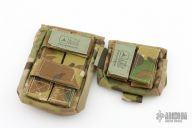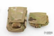 These vintage pouches by TAD Gear. The larger pouch is approximately 4.5"x4". Has an interior pocket, drain hole, and velcro attachment loops. The other pouch is approximately 5"x3.25". This pouch has a rigid backing velcro and molle velcro attachment straps. Excellent condition.
