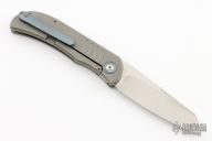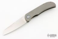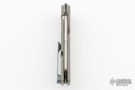 This LEXK Framelock from Burger Knives features a hand rub satin blade with notched front flipper and thumbrest. The handle is comprised of milled and bead blasted titanium frame with an anodized titanium tip up pocket clip, pivot collars and backspacer. Comes with a zippered case and COA. Excellent condition.