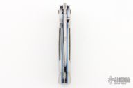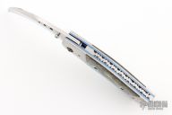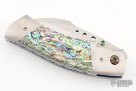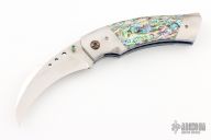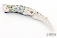 This Hornet Manual Prototype by Reese Weiland features a polished hawkbill blade with a single thumbstud with green stone inlay. The handle has 416 stainless steel bolsters and abalone scales over stainless steel liners, anodized and jeweled titanium liners, fileworked stainless steel backspacer. Nice detent, lockup and blade seating. Comes with a zippered case and COA dated 3/2001. Excellent condition.