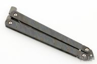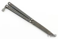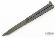 This balisong by Reese Weiland has a Damascus blade. The handles are flamed titanium with a stainless steel latch at the butt. Comes with a zippered case. Has some light scuffs, otherwise excellent condition.
