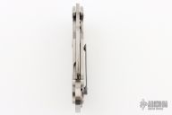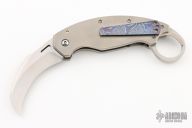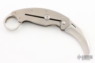 This trigger karambit by Reese Weiland features a hand rub satin finished hawkbill blade with thumbhole. The handle has an orange peel finished titanium frame with satin finished stainless steel ring/backspacer, tip up mokuti clip. Nice detent, lockup and blade seating. Excellent condition. This Trigger Karambit is the "XL" variant which has a slightly thicker build than earlier standard models. It also has an improved ball bearing pivot system which is "faster" than the earlier models. Comes with a zippered case.