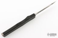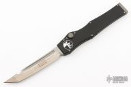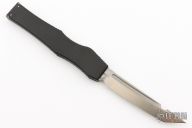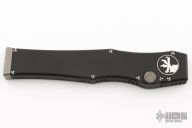 This Halo V OTF automatic has a satin finish tanto edge blade with a standard edge and a black aluminum frame. Dated 04/2010 and S/N 00728. Comes with original box, sheath, and papers. Excellent condition.