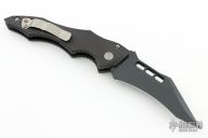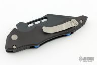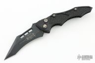 This Vector Automatic folder from Microtech features a black blade with notched thumb ramp. The handle is comprised of black anodized aluminum frame with non slip inserts over blue barrel spacers. Stainless steel inlaid lockbar. Tip down clip. Has original box, papers and sheath. S/N 00320 04/2011. Excellent condition.