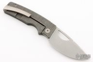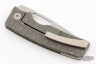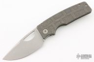 This knife by the OZ Machine Company features a tumbled Magnacut blade with thumbhole and notched thumbrest. The handle features a MAG milled titanium frame with a titanium backspacer and tip up pocket clip with hidden screws. Includes box and papers dated 9-21-23 and s/n 1244. Excellent condition.
