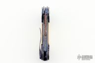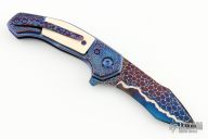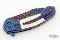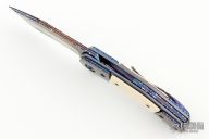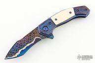 This one off flipper by Les Voorhies features a Les Voorhies San Mai Damascus blade with flipper. The handle has Les Voorhies Bubble Damascus bolsters and tip up pocket clip, walrus ivory scales with anodized titanium backing, anodized titanium screws and liners, Les Voorhies San Mai Damascus backspacer. Rides on bearings, nice detent, lock up and blade seating. Excellent Condition.