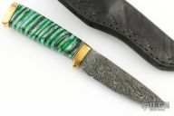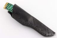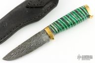 This knife by Ray Rantanen features a "Rayburst" Damascus blade with notched thumbrest, .145" blade stock and 1.302" blade depth, hidden tang construction. The handle has a brass guard and butt, mammoth tooth grip with black/white spacers. Comes with a hand tooled black leather sheath. Has some light oxidation, otherwise excellent condition.