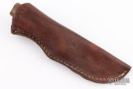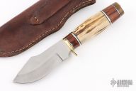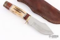 This knife features a polished blade with .141" blade stock and 1.557" blade depth, hidden tang construction. The handle has a brass guard, stag grip with black/aluminum/wood spacers, brass butt with aluminum butt plate. Comes with a brown leather sheath. Has a few light scratches, otherwise excellent condition.