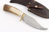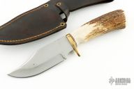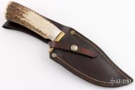 This knife by Harry L Morris features a satin finished blade with false top edge, .183" blade stock and 1.725" blade depth, hidden tang construction. The handle has a brass guard and a stag grip with black/white/red spacers. Comes with a brown leather sheath. Has some light scratches and patina, otherwise good condition. #427 dated '99