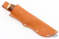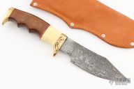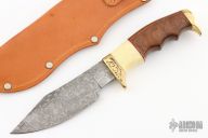 This knife features a Damascus blade with .134" blade stock and 1.545" blade depth, hidden tang construction. The handle has an engraved brass guard, wood and bone grip with red/brass spacers, brass butt. Comes with a brown leather sheath. Has some small nicks in the blade edge, otherwise good condition.
