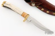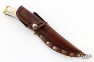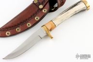 This knife by North and Prater features a mirror polished blade with .161" blade stock and .849" blade depth, hidden tang construction. The handle has a brass guard and butt with a stag grip and with black and wood spacers. Comes with a hand tooled brown leather sheath. Excellent condition. "8-93 2-027" on the ricasso.