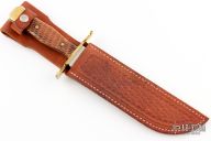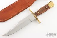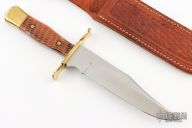 This bowie features a satin finished blade with false top edge, .175" blade stock and 1.327" blade depth, full tang construction. The handle has a brass guard and rear bolsters with jigged bone scales. Comes with a hand tooled brown leather sheath. Excellent condition.