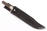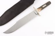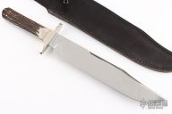 This Bowie by Steve Voorhis features a high polished clip point blade with false top edge, .236" blade stock, 1.865" blade depth, full tang construction. The handle has a nickel silver guard, stag scales with a nickel silver escutcheon. Comes with a black leather sheath. Excellent condition. Has a few very fine scratches.