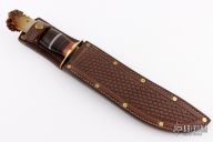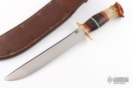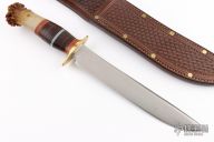 This fixed blade by Mike Malosh features a satin finished convex ground blade with .237" blade stock and 1.368" blade depth, hidden tang construction. The handle has a brass guard, crown stag butt with a brass pins, red/brass/leather/aluminum/black spacers. Includes a brown leather sheath with belt loop. Excellent condition.