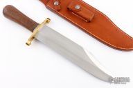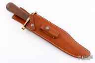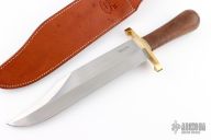 This Model 12-11 Smithsonian Bowie by Randall Made Knives features a satin finished carbon steel blade with sharpened top edge, .317" blade stock and 2.202" blade depth, hidden tang construction. The handle has a lugged brass guard, walnut grip, brass coolie cap butt cap. Comes with a brown leather sheath. Excellent condition.