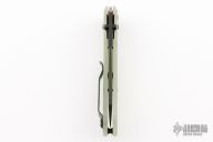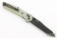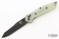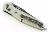 This 940BK Osborne Axis Lock Folder from Benchmade has a black coated clip point blade with false top edge and dual thumbstuds. Handle is jade G10 with a black finished stainless steel tip up clip (RH/LH Reversible). Nice blade seating and lockup. Comes with original box, papers, and drawstring pouch. Has a couple light scuffs, otherwise excellent condition.
