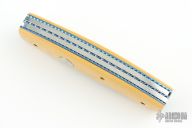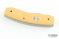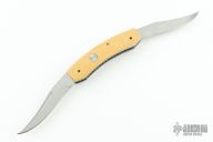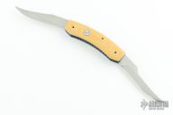 This Longhorn Prototype #2 by Rainy Vallotton features 2 polished mirror blades, one of which has a false top edge. The handle has ivory paper micarta scales with jeweled and anodized titanium liners with fileworked edges, and stainless steel backspacers. Anodized and fileworked titanium push buttons. One of the blades locks up solid, the other has vertical blade play, otherwise excellent condition. 3.75" blade, 4.375" closed, 8" with one blade open, 11.75" with both blades open.