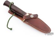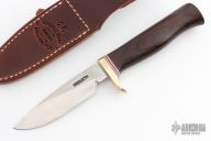 This Model 26 Pathfinder by Randall Made Knives is one of Randall's best selling models. It features a drop point satin finished blade with notched thumbrest, .181" blade stock and .968" blade depth, hidden tang construction. The handle has a brass guard, rosewood grip and red/white/blue spacers. Comes with a brown leather sheath and original paper wrapping. New from maker!