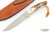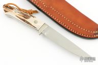 This knife by Koji Hara features a mirror polished blade with .159" blade stock and 1.013" blade depth, full tapered tang construction. The handle is comprised of a nickel silver guard and stag scales with black liners. Includes a brown leather sheath. T-015 on ricasso. Has some patina on the guard, otherwise the knife is in excellent condition.