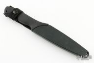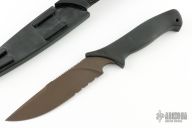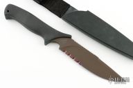 "The MPT was designed with the input and suggestions of U.S Marine Recon units and various United States Special Operations personnel. This knife was created from the desires and needs of multiple military units which wanted a light weight, high strength, non-magnetic, no-corrosive tool—a titanium bladed knife—with a more compact and thinner silhouette, and with a “higher speed and lower drag coefficient” than our popular U.S Navy MPK. The blade of the MPT has a distinctive false edge, which can be readily sharpened as the user chooses. Note the grooved section on the blade’s spine, which gives a better non- slip surface when applying pressure to the blade with the thumb. The MPTs ergonomic hilt was specifically designed to feel comfortable in either hand, and, at the same time, can easily be shifted into any aggressive grip style needed to meet any challenge. The parrot’s beak shaped butt of the hilt allows the user maximum purchase when using the blade in either the standard (hammer) grip, fence’s (sideways) grip, or ice-pick (reverse)grip." This fixed blade fighter has a 1/4" thick partially serrated titanium blade with 1 1/2" blade depth. Comes with rigid sheath with nylon belt loop. Excellent condition.