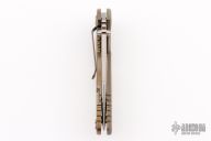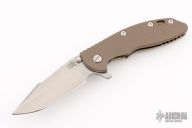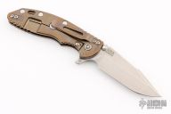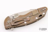 This XM-18 by Rick Hinderer features a stonewash finished blade with notched thumbrest and flipper. The handle has a FDE G-10 scale, stonewashed bronze titanium frame, and a tip up or down reversible titanium clip and filler tab, lanyard hole at the butt. Comes with original box and extra hardware. New condition.