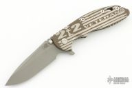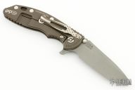 This XM-18 flipper from Rick Hinderer Knives features a 3.5" working finished S45VN blade, notched thumbrest and flipper, dual thumbstuds. The handle has a Battle Bronze titanium frame. Clip can be mounted for tip up or down carry. Nice lockup, seating, and detent.  Comes with original box, papers, and extra pivot washers. New condition. Only 50 Made