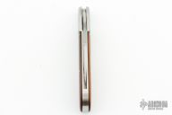 This slipjoint by K'roo Knives features a hand rub satin finished blade with nail nick. The handle has satin finished stainless steel bolsters and liners, vintage Westinghouse linen micarta covers with a stainless steel escutcheon, stainless steel spring. Has half-stop, flush in all positions. Has a few light scratches, otherwise excellent condition. Comes with a leather slip sheath. Comes with COA dated February 2023.